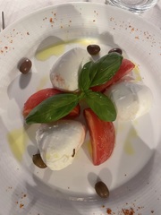 Menu: Beet Carpaccio with Goat Cheese Crumble, Arugula & White Balsamic Vinaigrette; Summer Vegetable Minestrone with Pesto and Rice; Grilled Pizza with Mozzarella Cheese, Cherry Tomatoes & Basil; Zucchini & Mint Fritters with Remoulade Sauce; Pici Pasta with Eggplant Meatballs with Fresh Pomodoro Sauce, Grilled Peach Crumble with Gelato