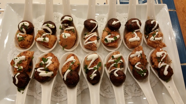 Menu: Antipasto Skewers Spiedini; Fried Ravioli; Baked Mushroom Bites; Mini Crab Cakes with Remoulade Sauce; Peach & Prosciutto Kebabs with Honey Drizzle; Mini Lobster Mac & Cheese; Chicken Meatballs Parmesan; Zucchini & Goat Cheese Fritters; Almond Coconut Macaroons