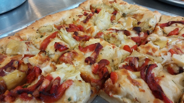 Menu: Grilled Pizza with Vegetables; The Baker's Pizza; Rosemary Focaccia; Breadsticks; Focaccia di Recco; Streghe; Nodini; Capponata; Ricotta and Spinach Calzone; Ham and Cheese Rolls; Sticky Buns